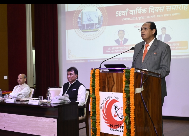 चंडीगढ़। भारत सरकार के शिक्षा मंत्रालय की विशिष्ट श्रेणी के अंतर्गत मानद विश्वविद्यालय, राष्ट्रीय तकनीकी शिक्षक प्रशिक्षण एवं अनुसंधान संस्थान (एनआईटीटीटीआर), चंडीगढ़ ने 7 सितंबर 2025 को अपना 58वां वार्षिक दिवस समारोह मनाया। कार्यक्रम की शुरुआत उत्तर भारत में आई विनाशकारी बाढ़ पर शोक व्यक्त करने और प्रभावित नागरिकों के साथ संस्थान की एकजुटता की पुष्टि करने के लिए दो मिनट के मौन के साथ हुई।