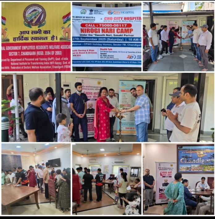 चंडीगढ़। केंद्रीय सरकारी कर्मचारी रेजिडेंट वेलफेयर एसोसिएशन (सीजीईआरडब्ल्यूए), सेक्टर-7, चंडीगढ़ द्वारा क्षेत्रीय स्वास्थ्य एवं परिवार कल्याण कार्यालय, चंडीगढ़ की पहल पर सिटी हॉस्पिटल, सेक्टर-8, चंडीगढ़ के सहयोग से “स्वस्थ नारी – सशक्त नारी” थीम के अंतर्गत 27 सितम्बर को एक निःशुल्क चिकित्सा शिविर का सफलतापूर्वक आयोजन किया गया।