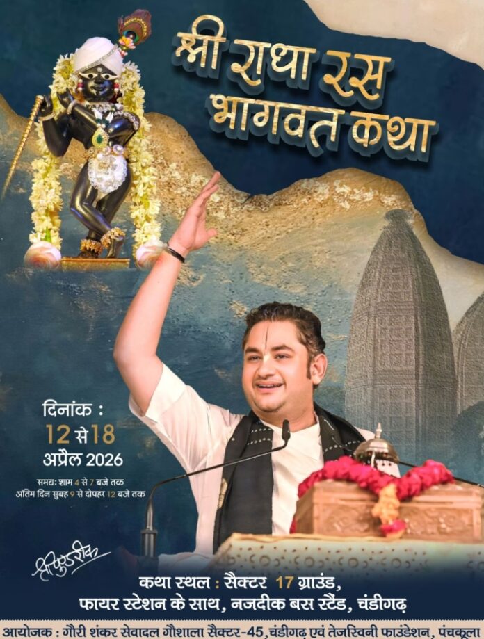 चंडीगढ़ कलयुग में भक्ति का प्रचार चरम पर है। संतो का कहना है ये प्रचार ही भक्ति की लहर है इसमें जो बह गया वो भवसागर से पार हो गया। भक्ति की लहर के इसी क्रम को आगे बढ़ाते हुए चंडीगढ़ सेक्टर 17, सर्कस ग्राउंड में 12 से 18 अप्रैल बरसाना प्रकट उत्सव श्री राधा रस भागवत कथा होने जा रही है I प्रसिद्ध कथावाचक श्री पुण्डरीक गोस्वामी द्वारा कथा कही जाएगी। गौरी शंकर सेवादल गौशाला सेक्टर 45, चंडीगढ़, तेजस्विनी फाउंडेशन पंचकूला और ट्रेस लाउन्ज की भक्ति भाव से कथा का आयोजन किया जा रहा है।